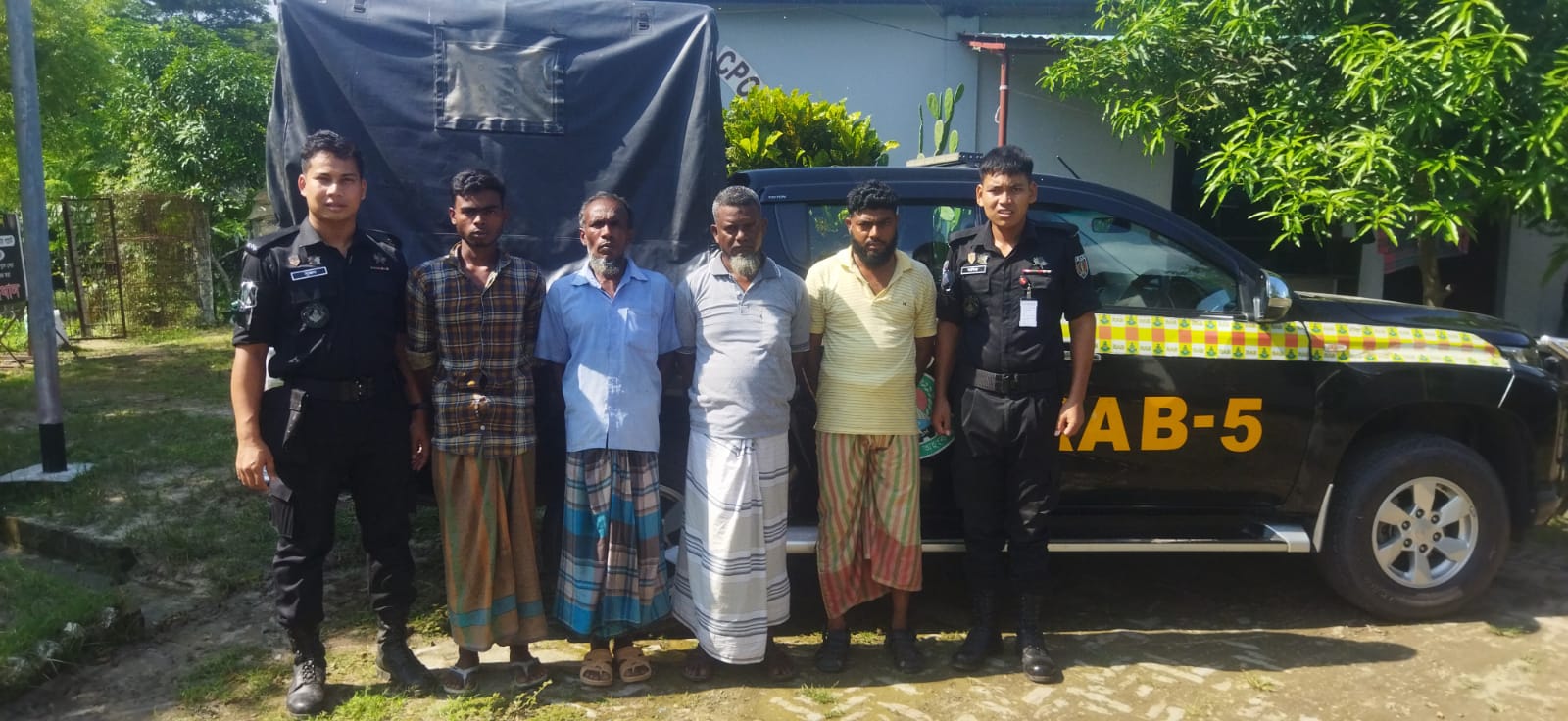 চাঁপাইনবাবগঞ্জ ক্যাম্প, র্যাব-৫, রাজশাহীর একটি অপারেশন দল ২৯ আগস্ট ২০২৪ ইং তারিখ ভোর ০৪:৩০ ঘটিকায় গোয়েন্দা তথ্যের ভিত্তিতে নওগাঁ জেলার নিয়ামতপুর থানাধীন ৮নং বাহাদুরপুর ইউনিয়নের আঘোরপাড়া গ্রামস্থ এলাকায় অভিযান পরিচালনা করে ১। মোঃ নুরুল ইসলাম (৪৩), পিতা-মৃত সামছুল হক, মাতা-সুন্দরী বেগম, সাং-আঘোর, থানা-নিয়ামতপুর, জেলা-নওগাঁ, ২। মোঃ খায়রুল ইসলাম (৫০), পিতা-মৃত রেজাউল হক, মাতা-হজেফা খাতুন, সাং-চরহাসানপুর (গাইপাড়া), থানা-শিবগঞ্জ, জেলা-চাঁপাইনবাবগঞ্জ, ৩। মোঃ মাসুদুজ্জামান মামুন (৪০), পিতা-মৃত শাখাওয়াত হোসেন, মাতা-মৃত মমতাজ বেগম, সাং-কুনিয়া, ইউপি-কলাতলা, থানা-চিতলমারী, জেলা-বাগেরহাট, ৪। মোঃ আল আমিন (১৯), পিতা-মোঃ নুরুল ইসলাম, মাতা-মোছাঃ সাবানা, সাং-আঘোর, থানা-নিয়ামতপুর, জেলা-নওগাঁদেরকে ৯০০ বোতল ফেন্সিডিল সহ গ্রেফতার করে।