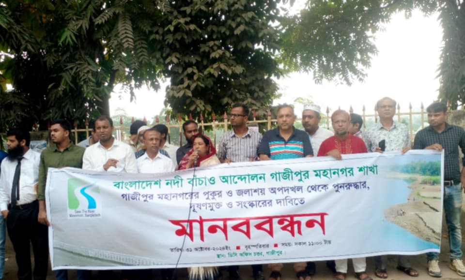 গাজীপুর মহানগরীর পুকুর ও জলাশয় অপদখল থেকে পুনরুদ্ধার, দূষণমুক্ত ও সংস্কারের দাবিতে মানববন্ধন অনুষ্ঠিত হয়েছে। বৃহস্পতিবার (৩১ অক্টোবর) সকাল ১১টায় বাংলাদেশ নদী বাঁচাও আন্দোলন গাজীপুর মহানগর শাখার উদ্যোগে গাজীপুর জেলা প্রশাসকের কার্যালয়ের সামনে এই মানববন্ধন কর্মসূচি পালন করা হয়। বাংলাদেশ নদী বাঁচাও আন্দোলন গাজীপুর মহানগর শাখার সভাপতি আবুল কালাম আজাদের সভাপতিত্বে ও সাধারণ সম্পাদক আহসান উল্লাহ বিপ্লবের সঞ্চালনয় মানববন্ধনে বক্তব্য রাখেন- সংগঠনের কেন্দ্রীয় কমিটির সভাপতি অধ্যাপক আনোয়ার সাদাত, কেন্দ্রীয় কমিটির সাধারণ সম্পাদক এড. আনোয়ার হোসেন, কেন্দ্রীয় কমিটির সহ-সভাপতি রফিকুল ইসলাম আলম, কেন্দ্রীয় কমিটির নির্বাহী সদস্য অধ্যক্ষ হুমায়ন কবীর, মহানগর শাখা যুগ্ম সাধারণ সম্পাদক এড. শাহ আলম মোল্লা, সাংগঠনিক সম্পাদক মাহবুবুল আলম শাহীন, ত্রান ও পুর্ণবাসন সম্পাদক মেরাজুল ইসলাম ভুইঁয়া, মফিজ উদ্দিন খান উচ্চ বিদ্যালয়ের প্রধান শিক্ষক আছমা আক্তার, কাজী আজিমউদ্দিন কলেজের সহকারী অধ্যাপক হামিদ শিকদার, মিলন হাসান, জুয়েল শেখ ও রাকিব হাসান তনু, আশা প্রমুখ।