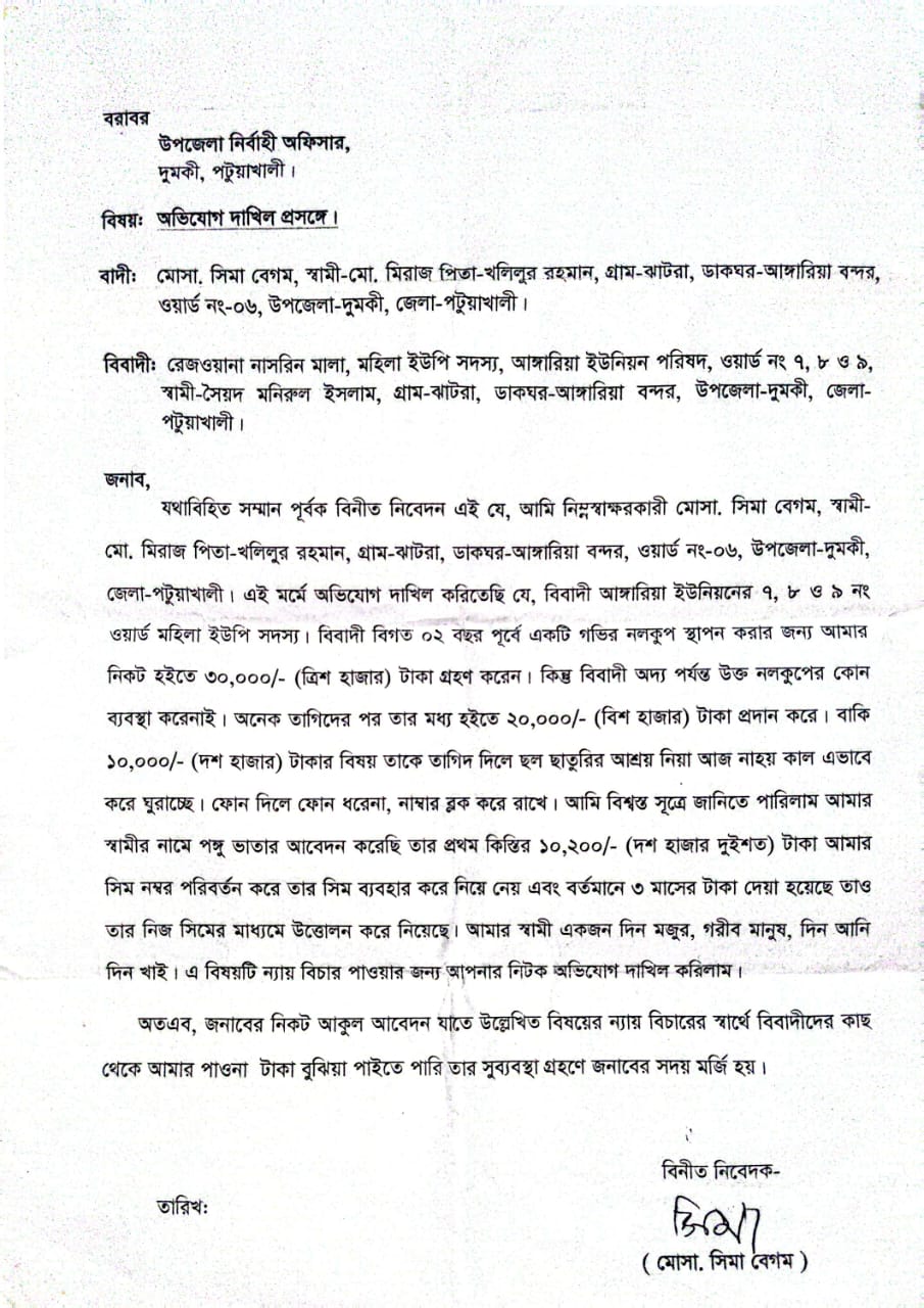 পটুয়াখালী জেলার দুমকি উপজেলার আঙ্গারিয়া ইউনিয়নের মহিলা ইউপি সদস্য রেজওয়ানা নাসরিন মালার বিরুদ্ধে টিউবওয়েল দেয়ার নাম করে টাকা আত্মসাতের অভিযোগ উঠেছে। এ বিষয়ে ভুক্তভোগী গৃহবধূ সিমা বেগম উপজেলা নির্বাহী কর্মকর্তার কাছে লিখিত অভিযোগ দিয়েছেন।অভিযোগে বলা হয়েছে, দুই বছর আগে ইউপি সদস্য টিউবওয়েল দেয়ার কথা বলে সিমার কাছ থেকে ৩০ হাজার টাকা নেন। কিন্তু দুই বছরেও টিউবওয়েল না পেয়ে টাকা ফেরত চাইলে নানা টালবাহানার পর ২০ হাজার টাকা ফেরত দিলেও বাকি ১০ হাজার টাকা ফেরত দেননি বলে অভিযোগ। এছাড়া সিমার প্রতিবন্ধী স্বামী মিরাজের ভাতার ১২ হাজার ৩০০ টাকাও ইউপি সদস্যের মোবাইল সিম নম্বর ব্যবহার করে তোলা হয়েছে বলে দাবি করা হয়েছে।ভুক্তভোগী সিমা বেগম বলেন, “টিউবওয়েল পাইনি, টাকা ফেরতও দেননি। স্বামীর ভাতার টাকাও দিচ্ছেন না।” স্থানীয়দের অভিযোগ, ইউনিয়নে ভাতার কার্ডের নামে এমন অভিযোগ নতুন নয়। তারা দ্রুত প্রশাসনের হস্তক্ষেপ কামনা করেছেন।অভিযুক্ত ইউপি সদস্য রেজওয়ানা নাসরিন মালা ২৮ হাজার টাকা নেওয়ার বিষয়টি স্বীকার করে বলেন, “বরাদ্দ না পাওয়ায় টিউবওয়েল দেওয়া সম্ভব হয়নি। পরে টাকা ফেরত দিয়েছি। প্রতিবন্ধী ভাতার টাকাও যথাসময়ে তাদের বুঝিয়ে দেওয়া হয়েছে। আত্মসাতের অভিযোগ ভিত্তিহীন।”