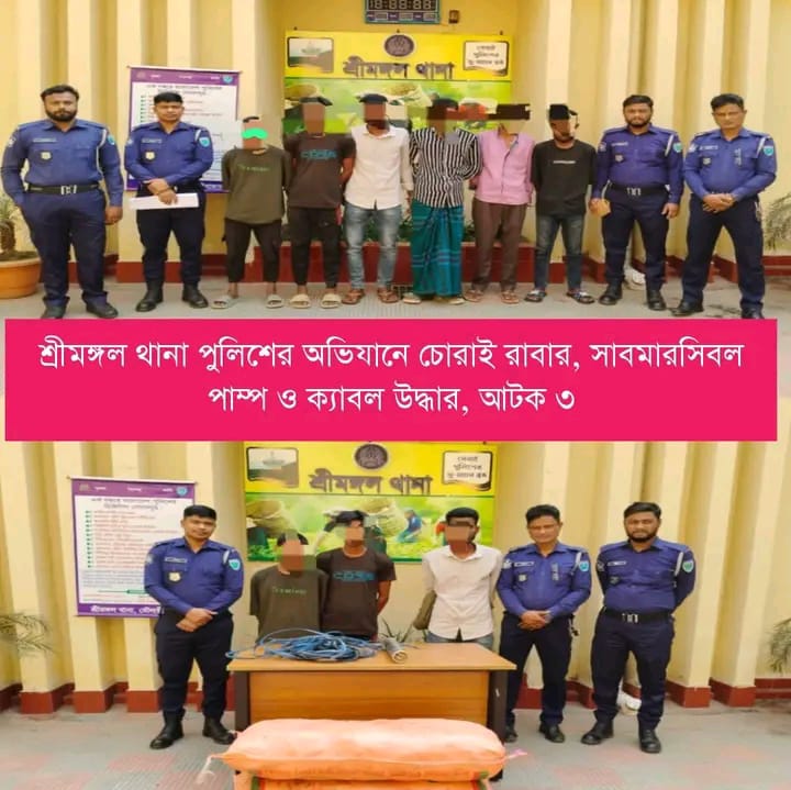 শ্রীমঙ্গল থানা পুলিশের অভিযানে চোরাই রাবার, সাবমারসিবল পাম্প ও ক্যাবল উদ্ধার, আটক ৩ জন