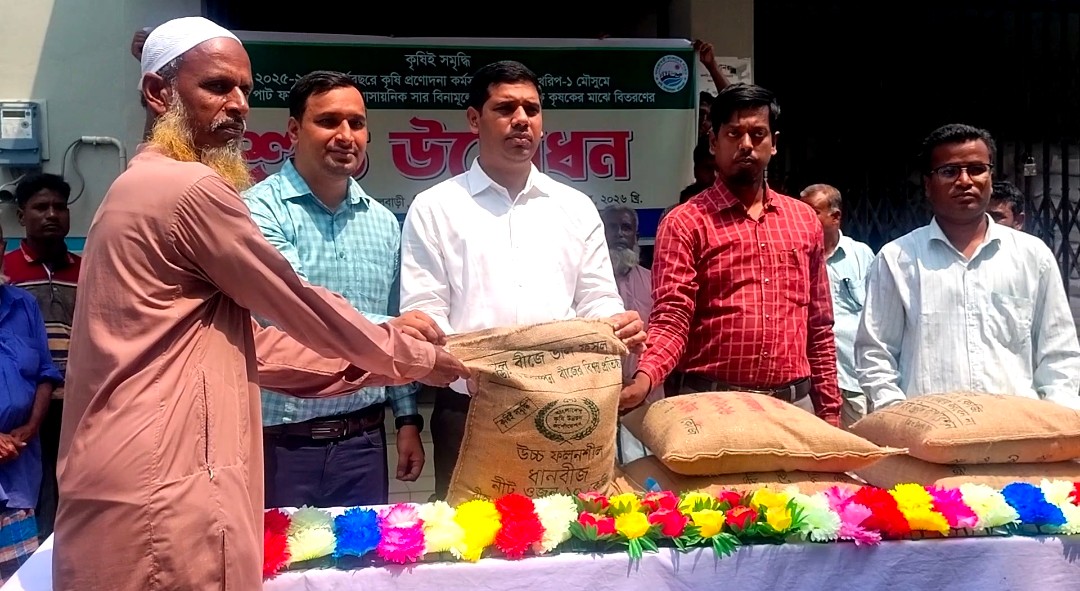 দিনাজপুরে ফুলবাড়ীতে ২০২৫-২৬ অর্থবছরের কৃষি প্রণোদনা কর্মসূচির আওতায় ফুলবাড়ী উপজেলায় ক্ষুদ্র ও প্রান্তিক কৃষকদের মাঝে আউশ ধান ও পাট ফসলের বীজ এবং রাসায়নিক সার বিনামূল্যে বিতরণ করা হয়েছে।