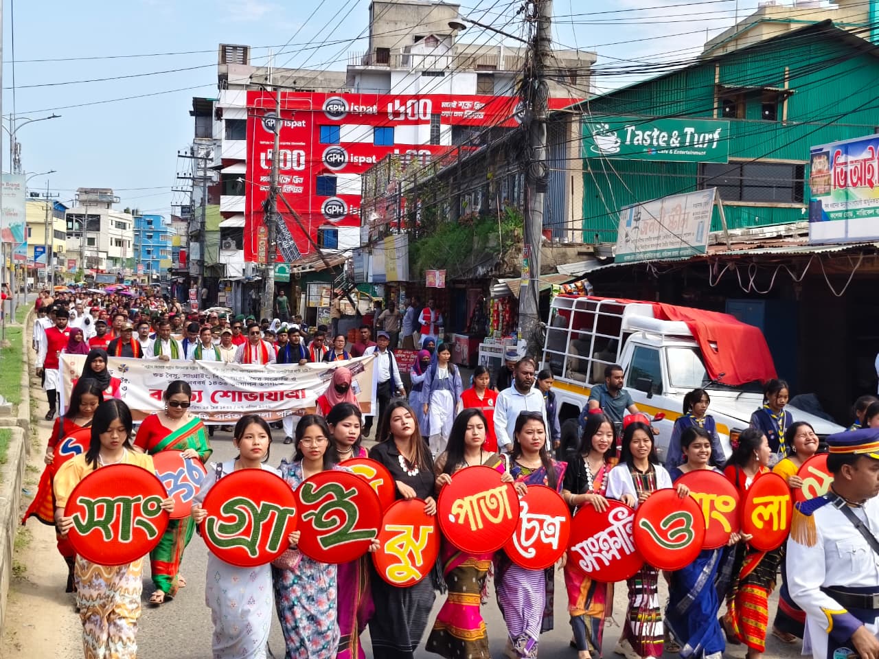 সকাল ৯টায় জেলা পরিষদ প্রাঙ্গণ থেকে শুরু হওয়া শোভাযাত্রাটি শহরের প্রধান প্রধান সড়ক প্রদক্ষিণ করে টাউন হলে গিয়ে শেষ হয়। নতুন বছরকে বরণ এবং পুরোনোকে বিদায় জানানোর এই আয়োজনে অংশগ্রহণকারীরা নিজেদের ঐতিহ্যবাহী পোশাক, বর্ণিল অলংকার ও বাদ্যযন্ত্রে সজ্জিত হয়ে উৎসবকে করে তোলেন প্রাণবন্ত ও দৃষ্টিনন্দন।