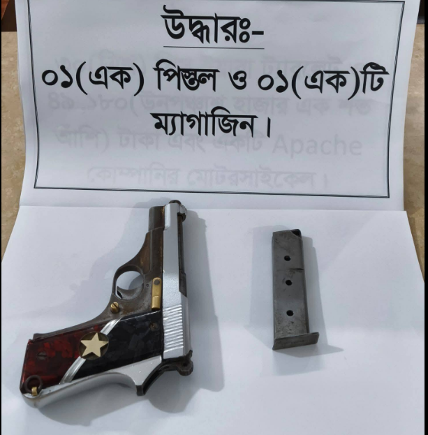 ১ টি বিদেশী পিস্তল ও ১ টি ম্যাগাজিন এবং সন্ত্রাসী কাজে ব্যবহৃত মোটরসাইকেল উদ্ধার সহ ০২ জন গ্রেফতারঃ কেএমপি