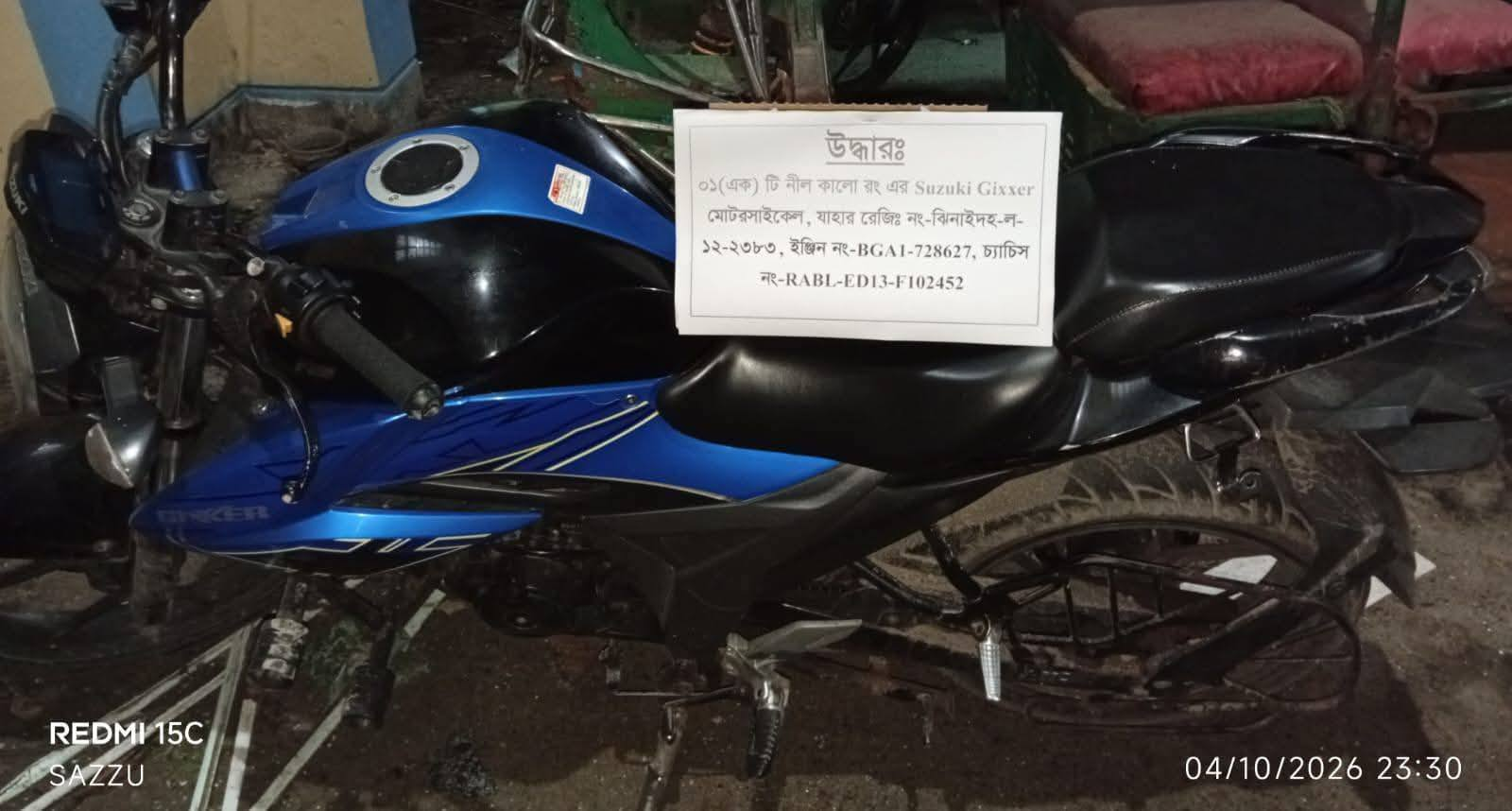 ০১(এক) টি অবৈধ বিদেশী পিস্তল, ম্যাগাজিন এর ভিতরে ০৪(চার) রাউন্ড গুলি সহ ০১(এক) টি Suzuki Gixxer মোটরসাইকেল উদ্ধার।
