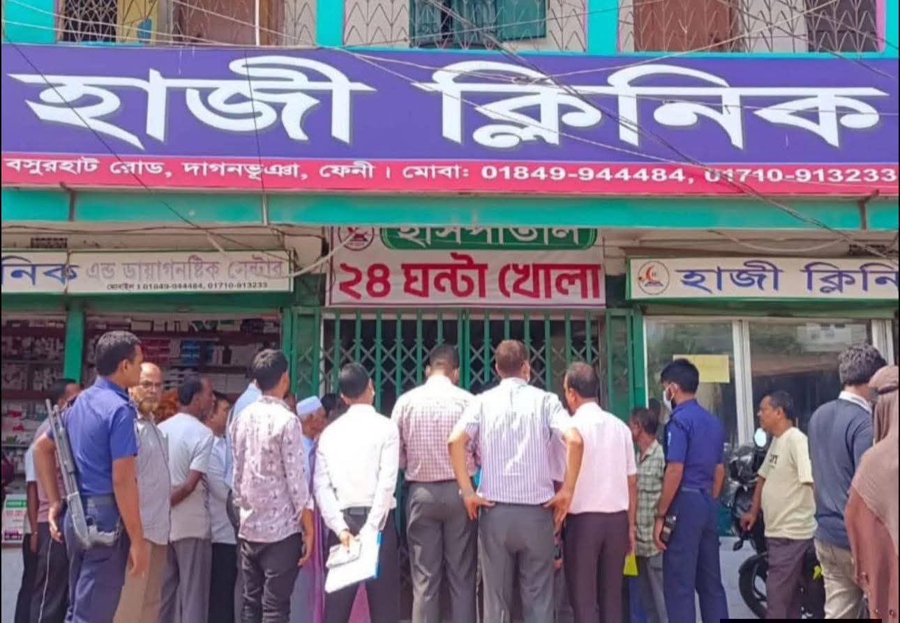 ফেনীর দাগনভূঞা উপজেলার বসুরহাট রোডে অবস্থিত ‘হাজী ক্লিনিক’ নামক একটি বেসরকারি স্বাস্থ্যসেবা প্রতিষ্ঠান সিলগালা করে দিয়েছে উপজেলা স্বাস্থ্য বিভাগ। আজ সোমবার ১৩ এপ্রিল, ২০২৬ইং বৈধ লাইসেন্স ও প্রয়োজনীয় অনুমোদন না থাকায় এই অভিযান পরিচালনা করা হয়।