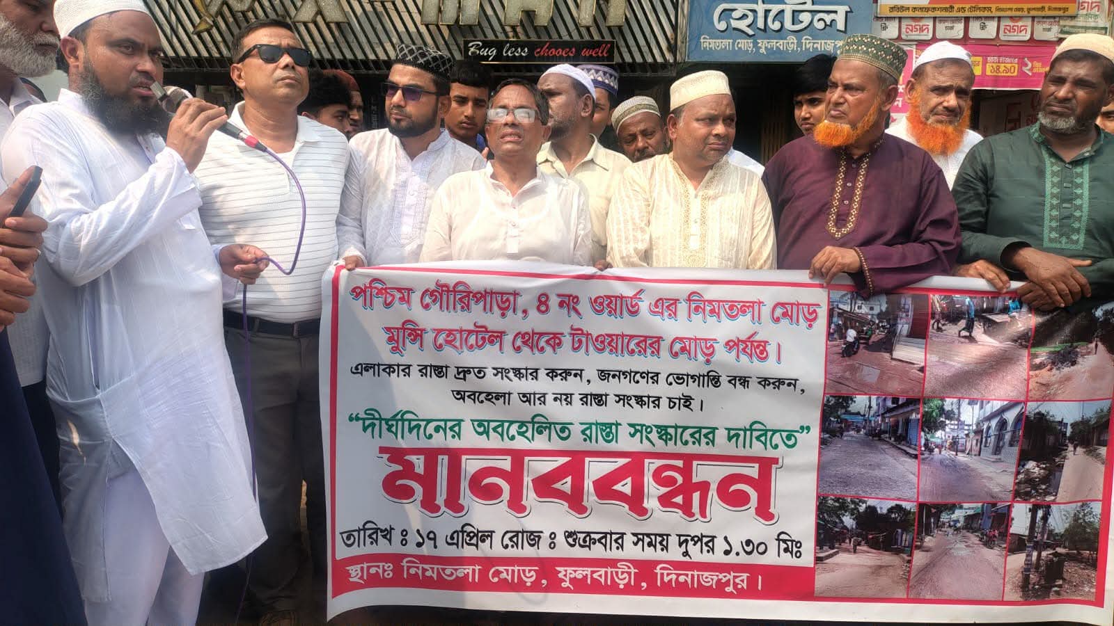 ফুলবাড়ী পৌরসভার ৪ নং ওয়ার্ডের রাস্তা সংস্কারের দাবিতে এলাকাবাসীর মানববন্ধ
