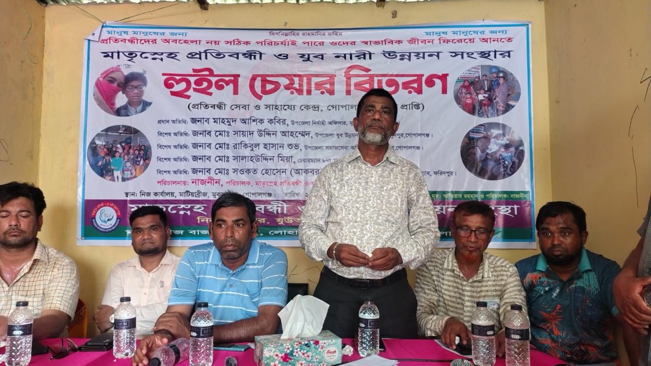 গোপালগঞ্জে মাতৃস্নেহ প্রতিবন্ধী ও যুব নারী উন্নয়ন সংস্থা প্রতিবন্ধীদের মাঝে হুইল চেয়ার বিতরণ